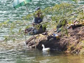 人っ子ひとりいない閑静さにひたり ぼんやり湖面を眺めていると 岩の上でのんびりと釣りをしている人がいる。その横で アヒルが一緒に寄り添って 遊んでいるように見える。 きっと時々餌をくれる 優しいおじさんなんだろうなあ。