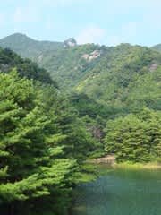 先日の竜門ダムとは反対側になり こちらからも 黒髪山が遠くに望めます。中央の岩肌が見える尖った山が 黒髪山の頂上になり クサリがかかっていて登れるようになっていて、小学生の遠足コースでもあります。