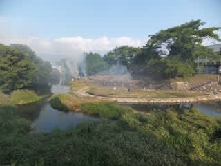 一斉に燃やすので 地区のあちこちで 白い煙が立ちのぼる。 こうして地区住民で川を守っていく連帯感がある。