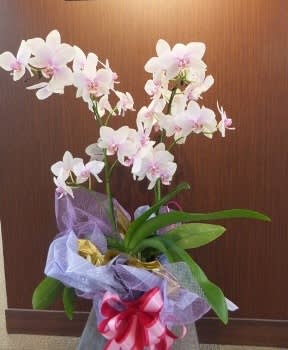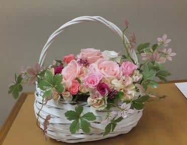 「今回 用事で行けなくて お花を贈ります」と素敵な花かごを