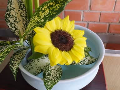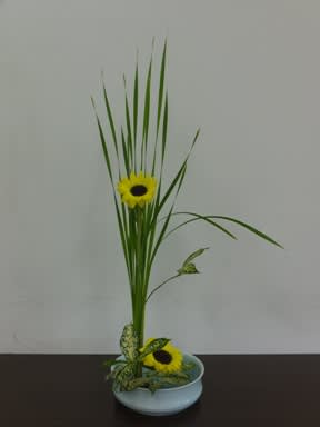 ヒマワリ ガマ(長い緑の葉) ゴット(根元に活けている葉)