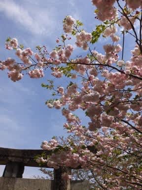 神社の境内では 八重の桜が とても綺麗に 咲き誇っています