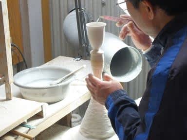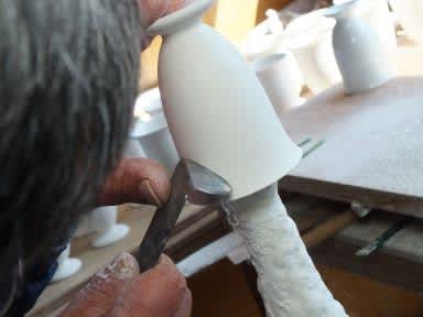 夫は 上手にバランスをとって ろくろを回しながら削っていきます