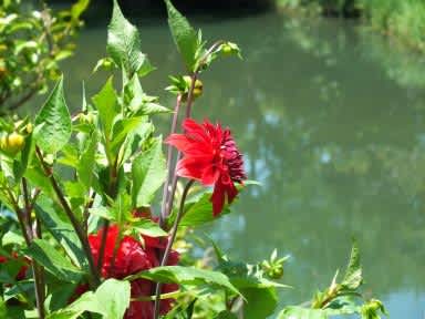 川沿いを歩くと 遠目にも 赤いダリアが目に入ります