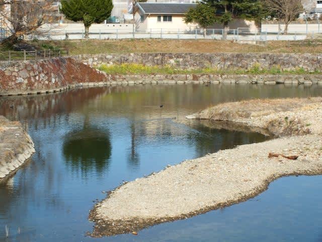 川面に映りこんだ菜の花の中を カモが 美しい弧を描いています