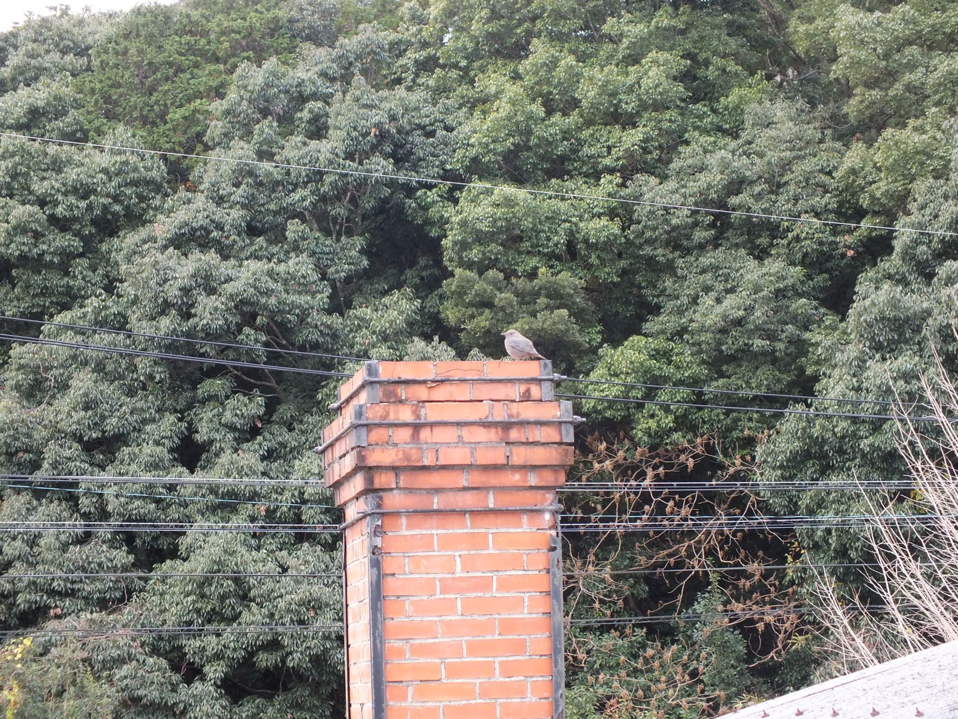今朝 ふと見上げたら 煙突の縁に小さなお客さまが来てくれています。